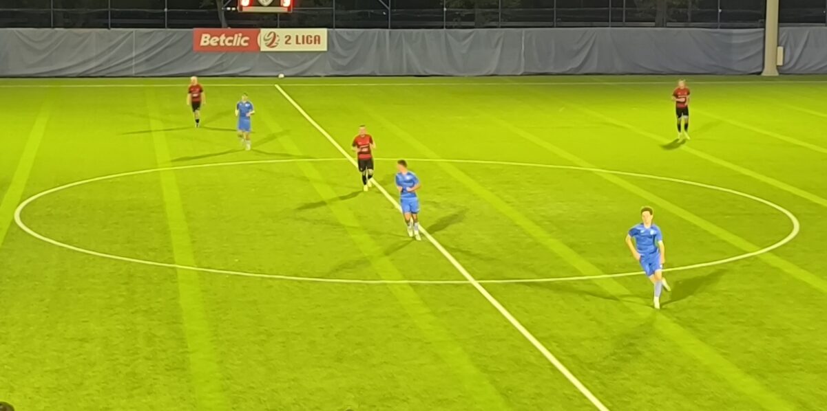 Dopiero w tym momencie coś drgnęło w naszej ekipie. Najpierw Kacper Merta uderzył po ziemi po raz pierwszy właściwie zmuszając do interwencji Leona Rosiaka, a później swoich szans szukali Seweryn Cieślak czy Kacper Tomzik. Cały czas jednak zawodnicy prowadzeni przez Tomasza Szymczaka musieli zachowywać czujność, bowiem w 34. minucie po stracie w środku pola po raz drugi próbował umieścić piłkę w siatce Porochnicki (jego strzał został zablokowany), a tuż przed gwizdkiem zapraszającym piłkarzy na przerwę tuż obok słupka uderzył Adrian Żabik.