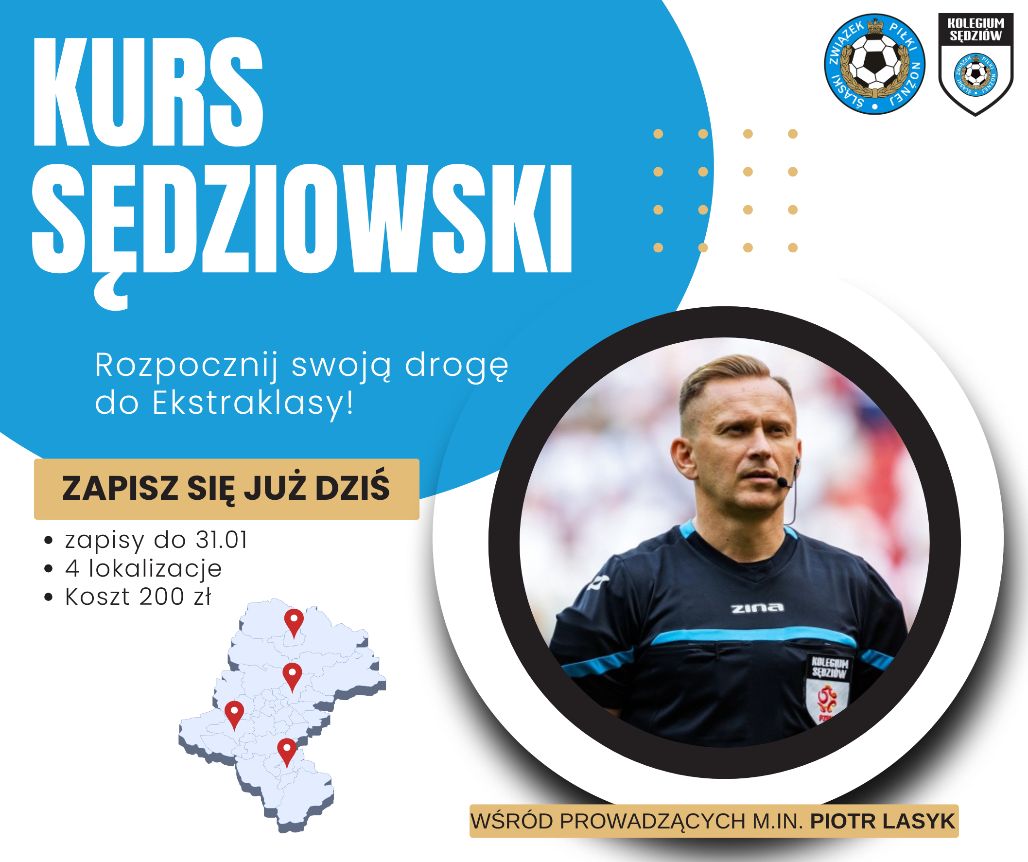 Kurs, którego organizatorem jest Kolegium Sędziów Śląskiego Związku Piłki Nożnej rozpocznie się 14 lutego i potrwa do 29 marca. Zajęcia odbędą się w czterech lokalizacjach i poprowadzą je sędziowie PKO BP Ekstraklasy, 1. 2. oraz 3. Ligi.